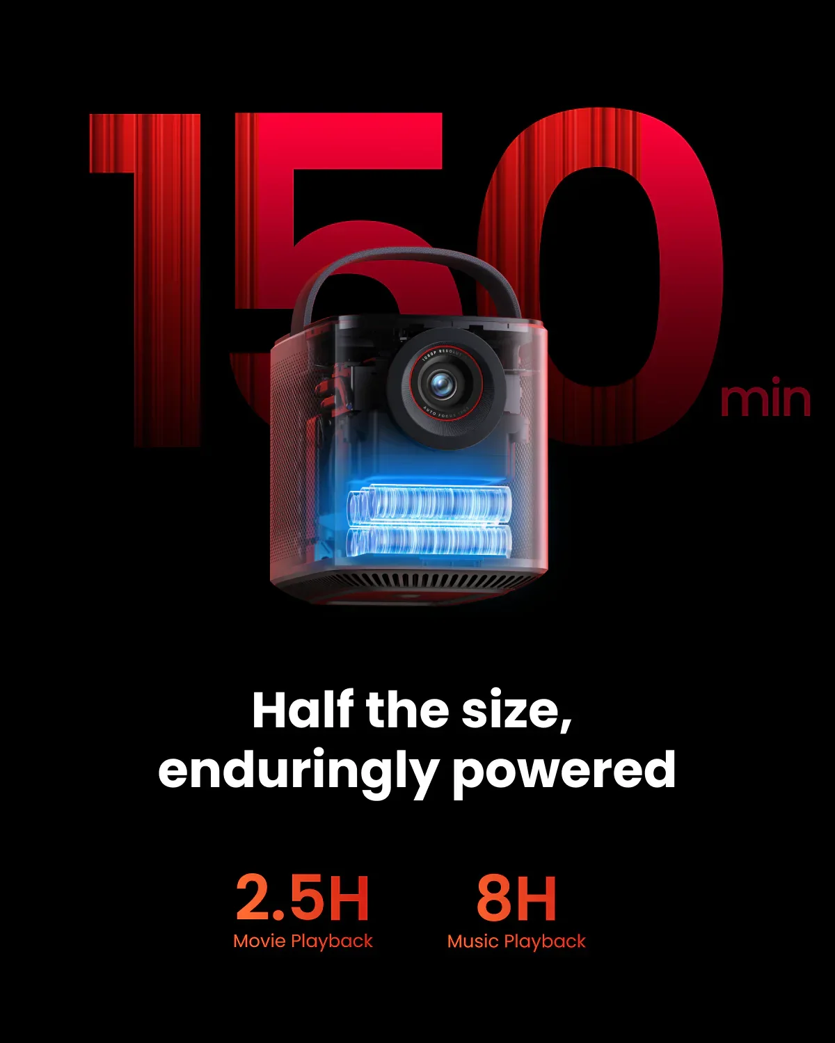 Enjoy up to 2.5 hours of video playback or 8 hours of music on a full charge—perfect for movie nights, camping trips, or casual gatherings.