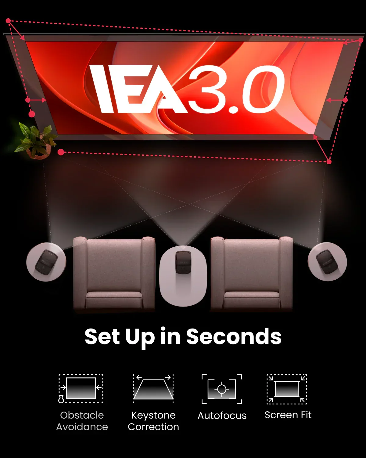 With Intelligent Environment Adaptation (IEA) Technology, setup is effortless. The projector automatically performs autofocus, auto keystone correction, and obstacle avoidance within seconds—ensuring a perfect image every time.
