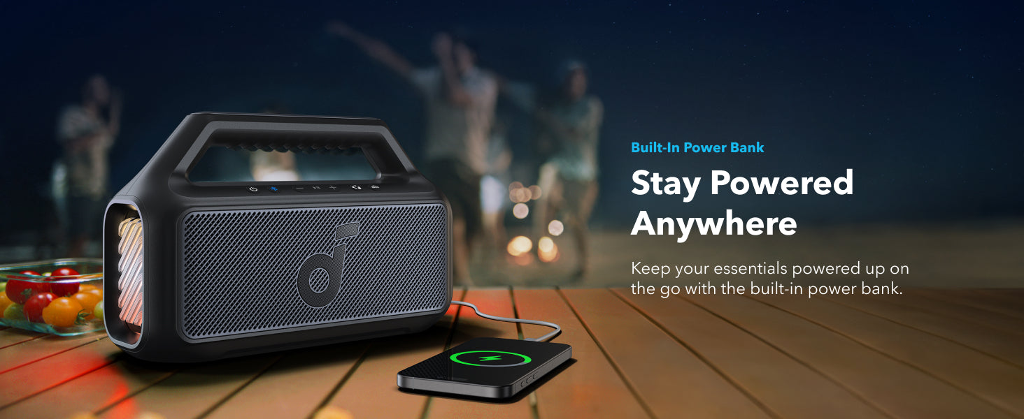 Keep the music going for up to 24 hours on a single charge. The built-in power bank also keeps your phone charged on the go—perfect for road trips, beach days, or outdoor parties. (Playtime may vary based on volume and playback content.)