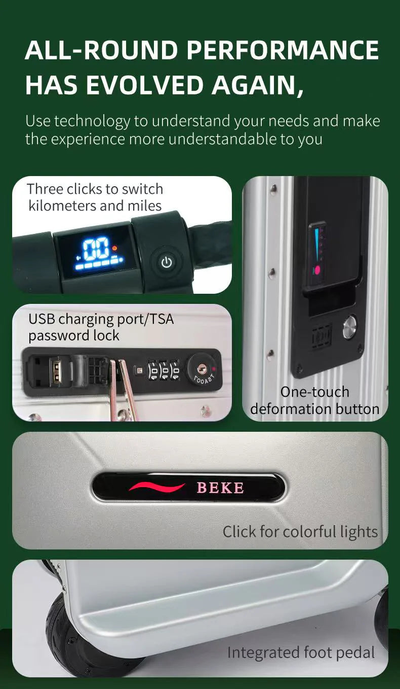 Travel smarter with the BEKE ES06 Smart Electric Suitcase, designed for modern travelers who value innovation and convenience. Equipped with an LCD display, this suitcase integrates electric mobility and a sleek, durable design for effortless travel anywhere.