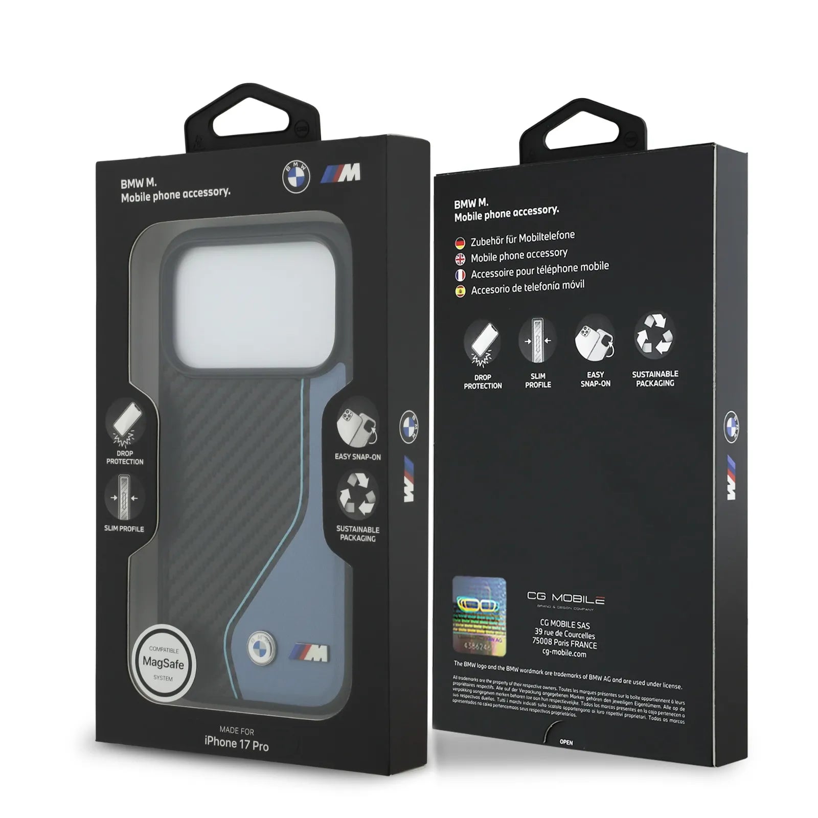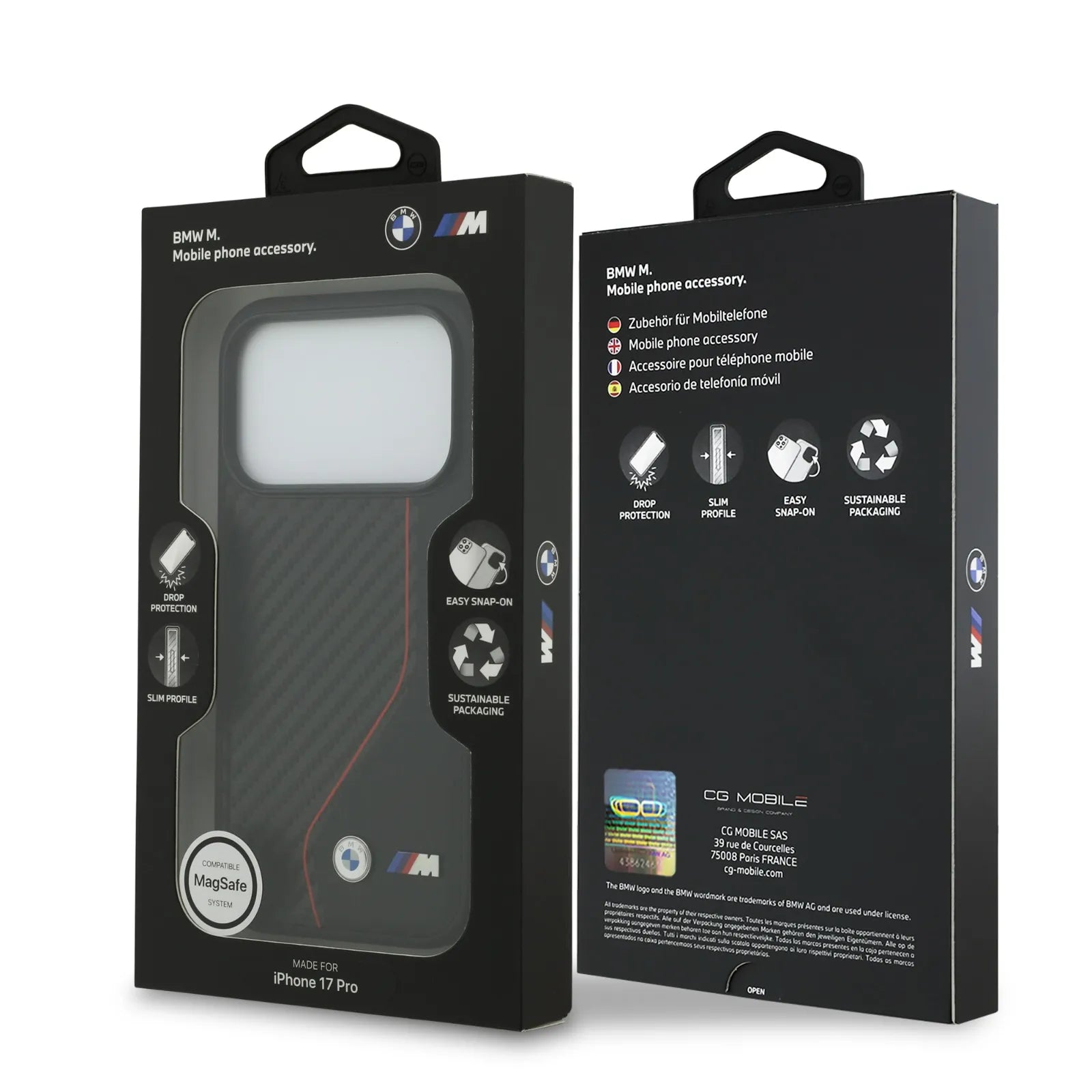 A bold colored line stitch gives the case a sporty yet elegant touch, adding a unique and dynamic flair to the overall design. Installation is quick and effortless thanks to its snap-on function, while MagSafe compatibility ensures smooth connections to chargers and accessories. Packaged with sustainability in mind, it reflects BMW’s eco-conscious approach.