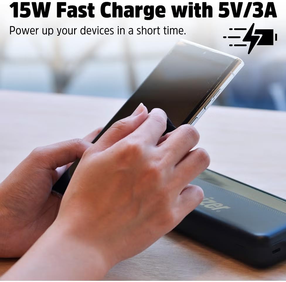 Power up with speed and simplicity. The Energizer 10,000mAh Rapid Charging Power Bank is your on-the-go solution for reliable and efficient charging. With a compact design and triple output ports, including 2 USB-C and 1 USB-A, it lets you charge up to three devices simultaneously—perfect for smartphones, tablets, earbuds, and more.