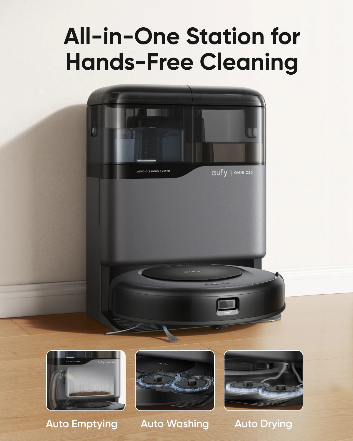 eufy Robot Vacuum Omni C20 offers fully automated cleaning with features like auto emptying, washing, drying, and water refilling. The station dries the mop with room-temperature air and has transparent water tanks, allowing you to easily monitor water levels without opening them. This hands-free system ensures effortless maintenance.
