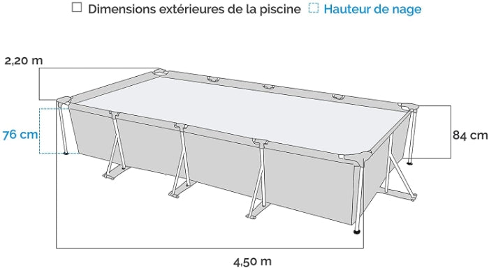 Intex 28273 rectangular frame pool. Practical and easy to assemble and disassemble Designed to host a filtering system. Made of triple layer laminated PVC. Approx set-up size: 450cm x 220cm x 84cm Water Capacity(90%): 1,883gal(7,127L) Good for 6-7 persons. Pool made from puncture resistant 3-ply material Zinc-plated and powder-coated frame design