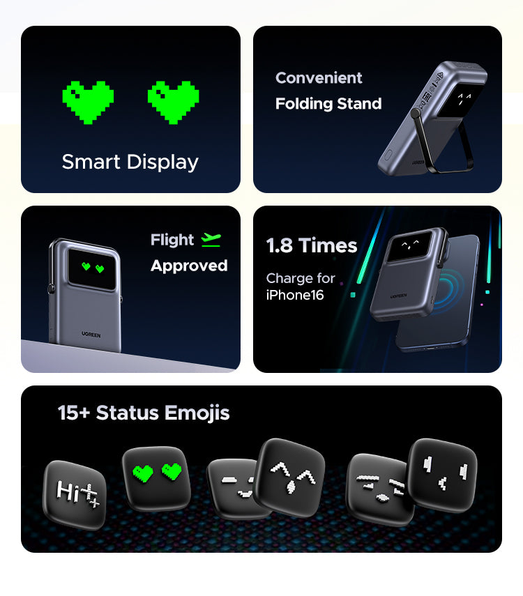 A unique TFT display shows the remaining battery level using expressive animations, adding a touch of fun while keeping power status clear at a glance.