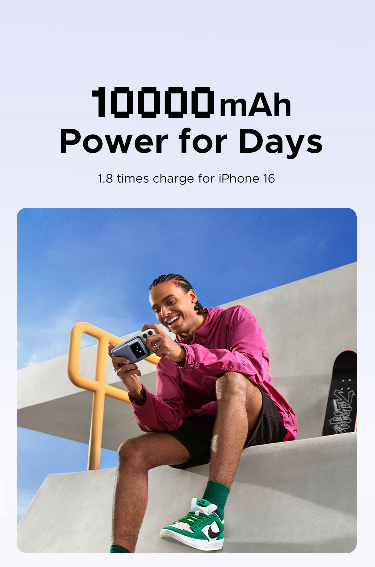 Despite its ultra-compact design, this 10,000mAh power bank delivers enough power to charge most smartphones and tablets 1–2 times. Its small size makes it easy to slip into your pocket or bag, making it perfect for commuting or travel.