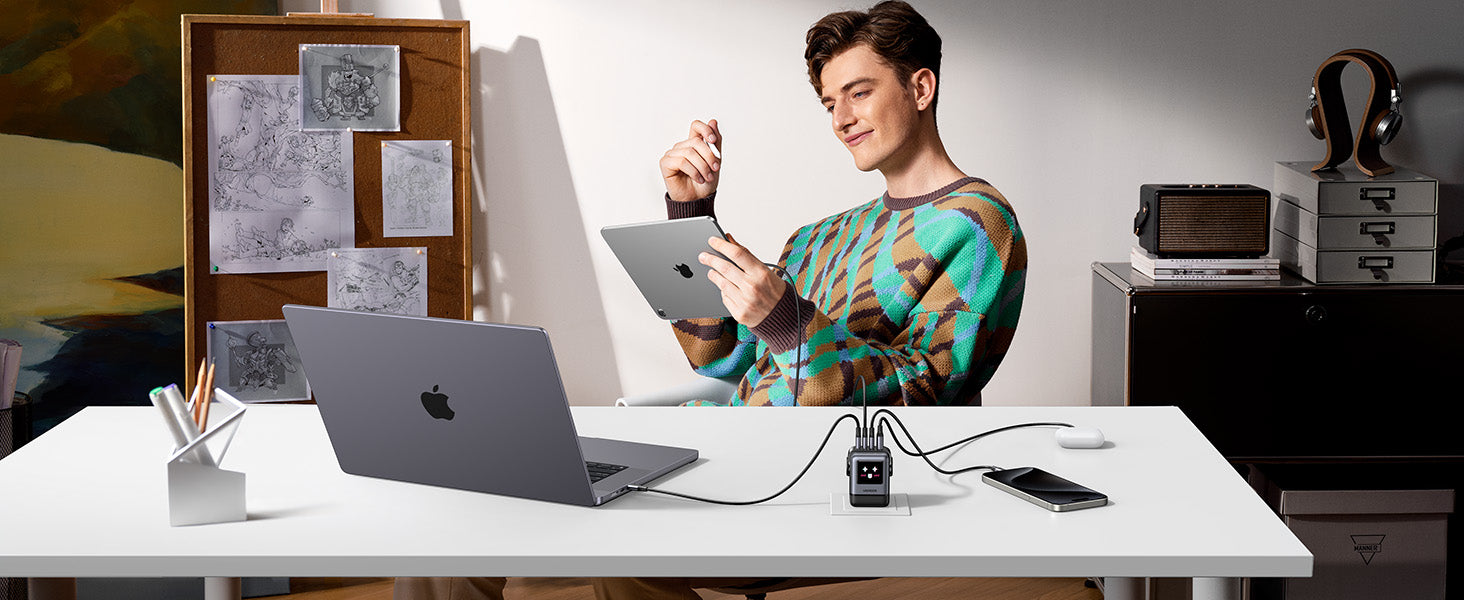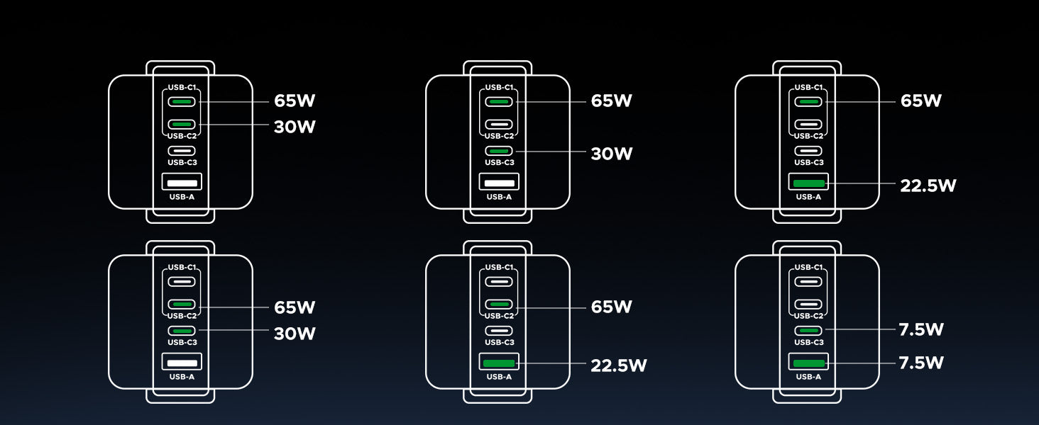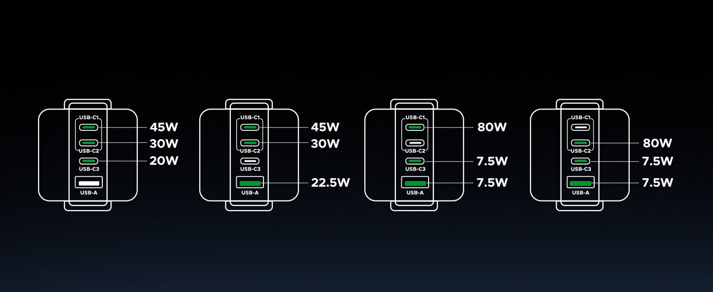 Equipped with 3 USB-C ports and 1 USB-A port, it supports simultaneous charging for up to 4 devices, with intelligent power distribution to ensure optimal charging speeds for each.