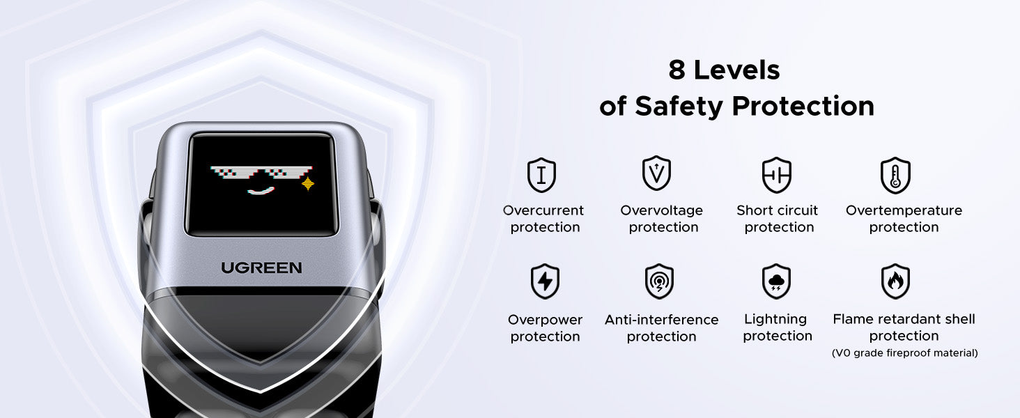 Safety Features: 8-layer protection including overvoltage, overcurrent, overheating, and short-circuit protection