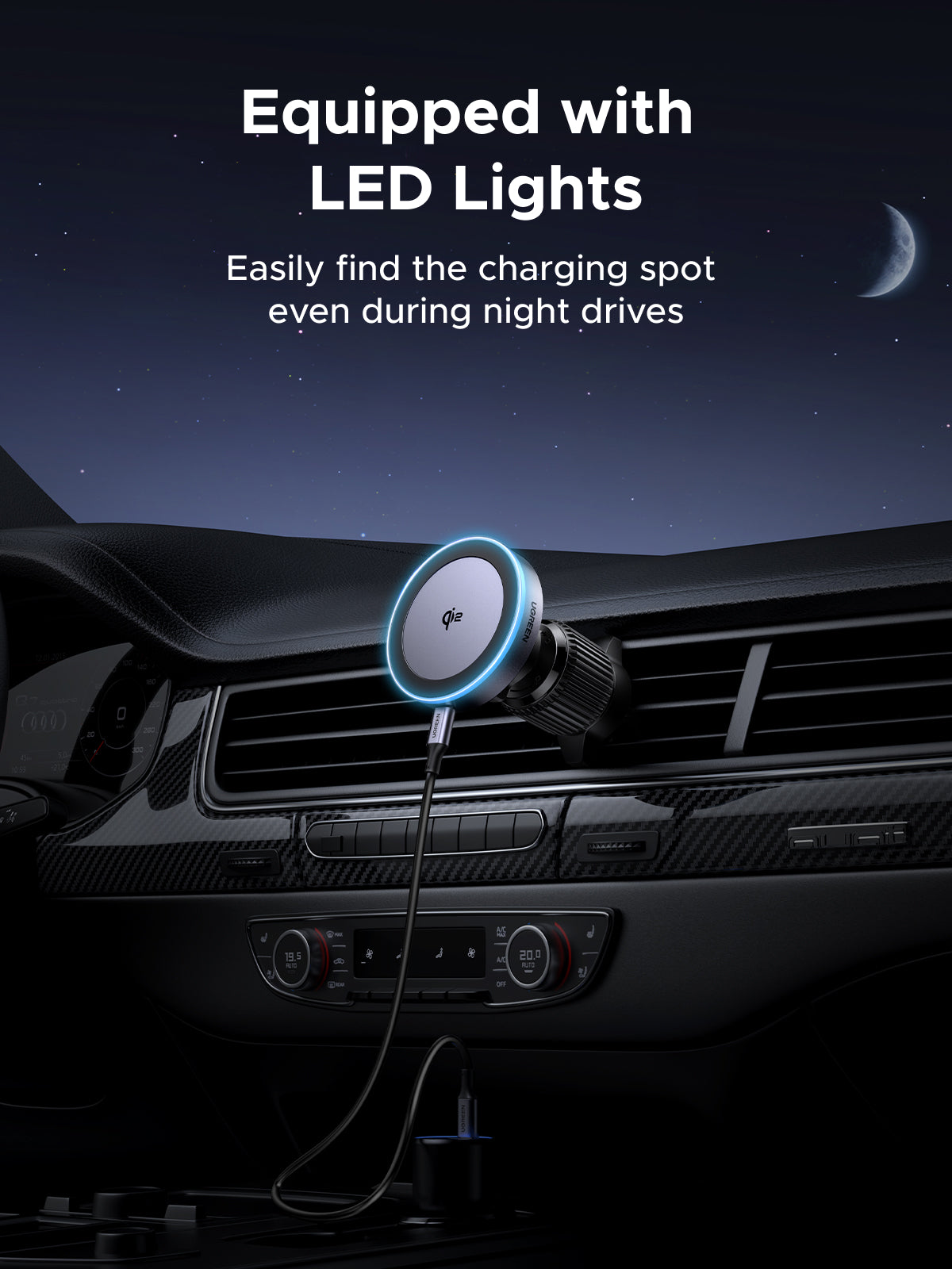 Ambient gradient lighting makes it easy to find the charging zone at night without glare