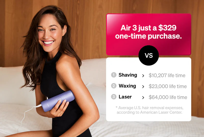 Upgrade your hair removal experience with Air 3! Our patented Sapphire Ice-cooling Technology maintains skin temperature at a comfortable 50°F, preventing heat damage while concentrating IPL pulse light solely on hair follicles for effective, pain-free hair removal.