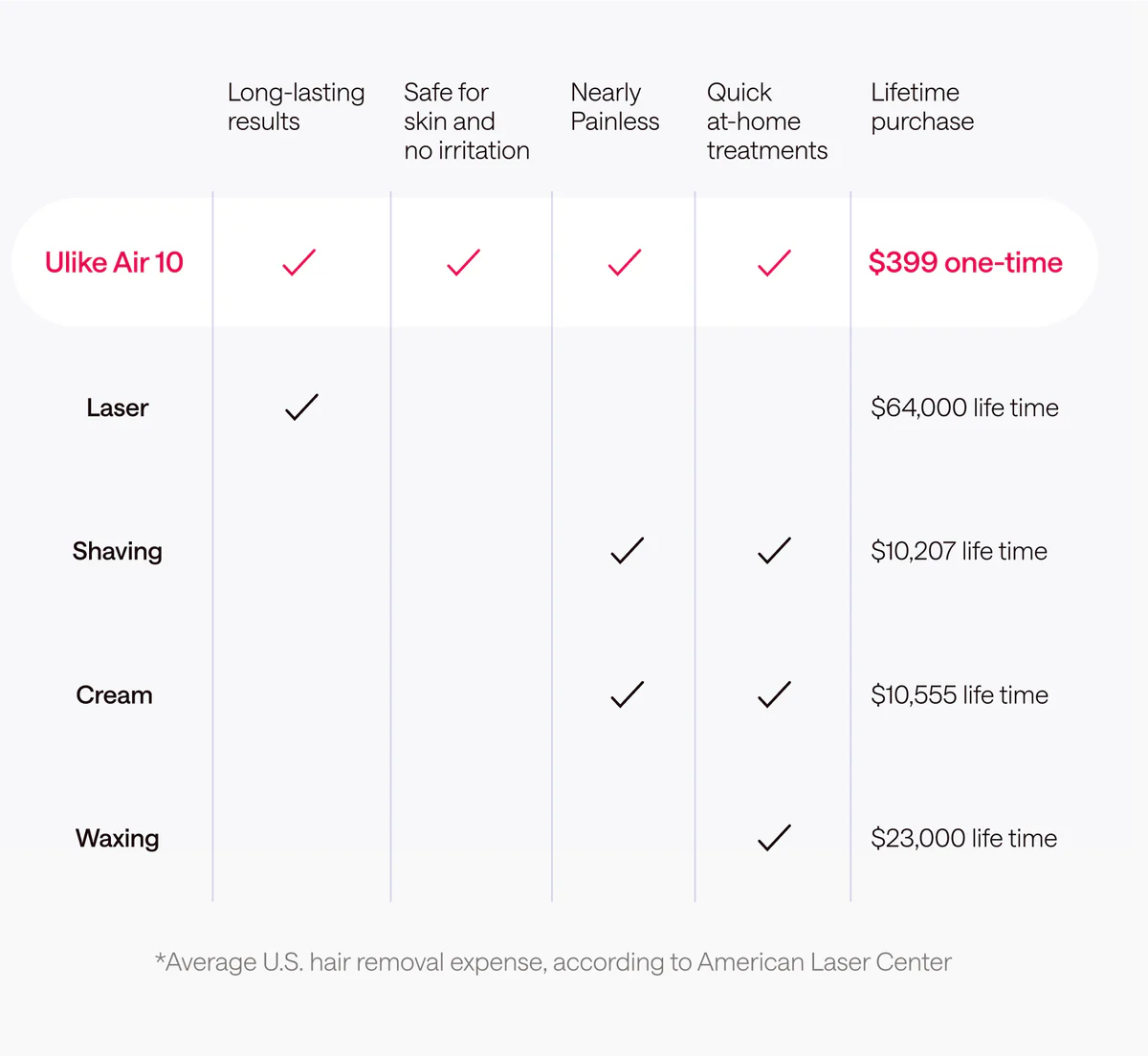 -Nearly Painless Hair Removal From Home: Designed with our newest sapphire ice-cooling technology, Ulike Air 10 hair removal device retains a contact temperature below 65°F* for full-body sessions even after 30 mins, so you can enjoy nearly painless and skin-safe hair removal treatment from head to toe – including legs, arms, underarms, bikini line, and even your face.